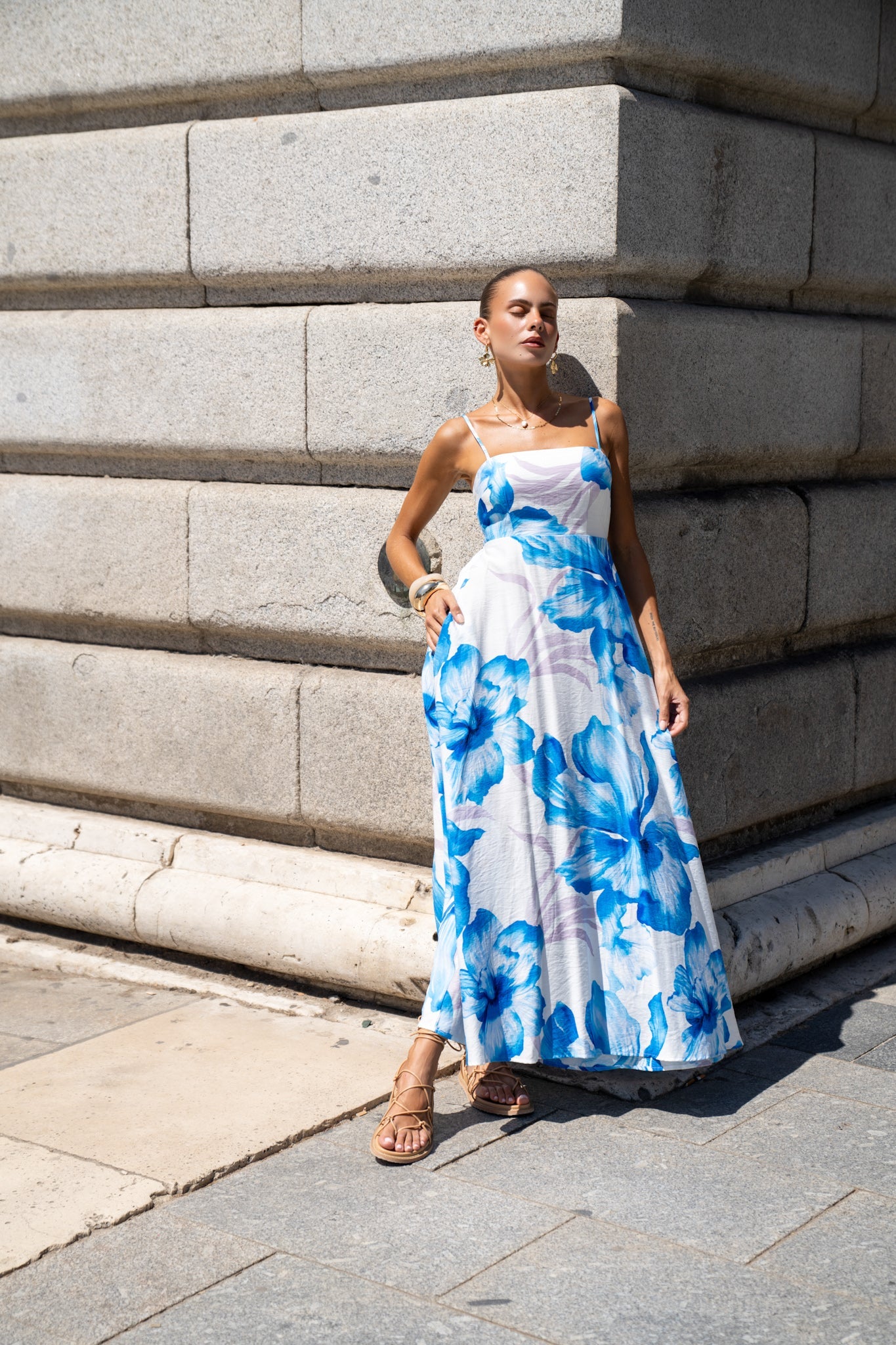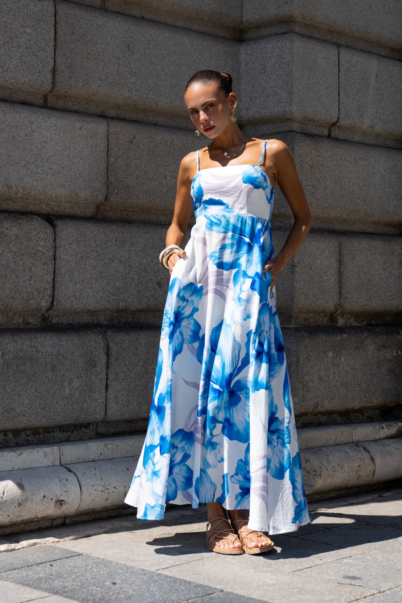 The cut is flattering on just about everyone (seriously), thanks to that breezy A-line silhouette, shirred back panel, and those dainty shoulder straps that give “sun-kissed goddess” energy. But the real star? That oversized blue floral print. Not shy. Not subtle. Just bold, painterly strokes of cerulean and cobalt, like tropical blooms exploded across a canvas.