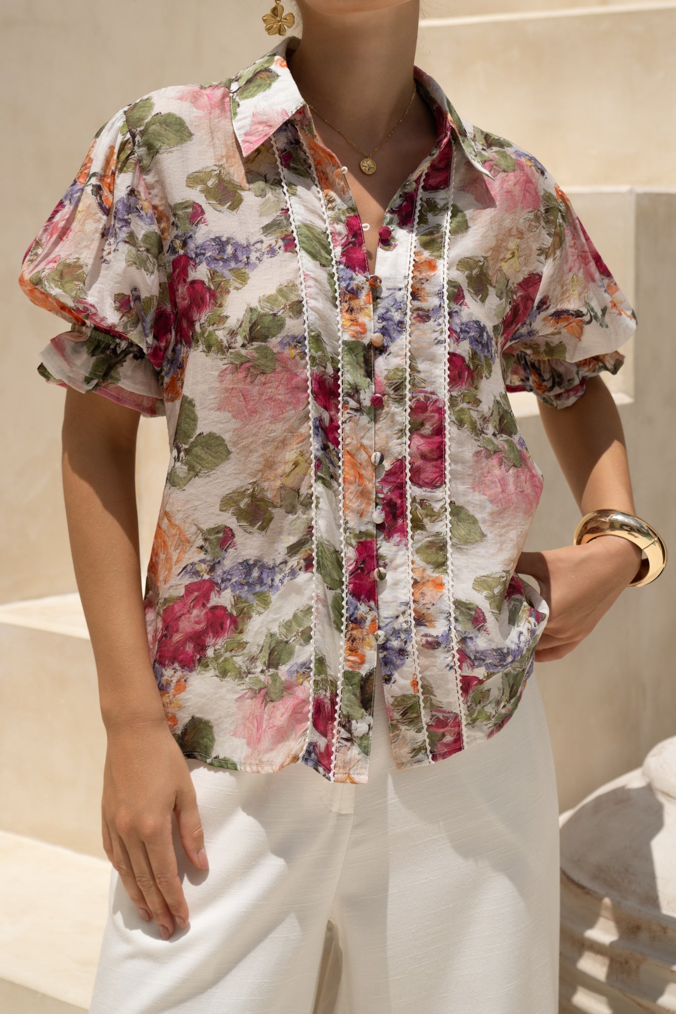 The puff sleeves? They don’t just add charm. They steal the spotlight. Finished with dainty ruffles at the cuffs, they balance playful and polished like a pro. And that floral print... a tangled garden of wild roses, peachy petals, lilac whisps and lush greens. It’s like wearing a watercolour daydream. Pair her with white linen pants (as shown), vintage denim, or tuck her into a slip skirt. She’s as versatile as she is vivacious. Plus those vertical lace trims? Yeah, they’re doing magical things for your silhouette.