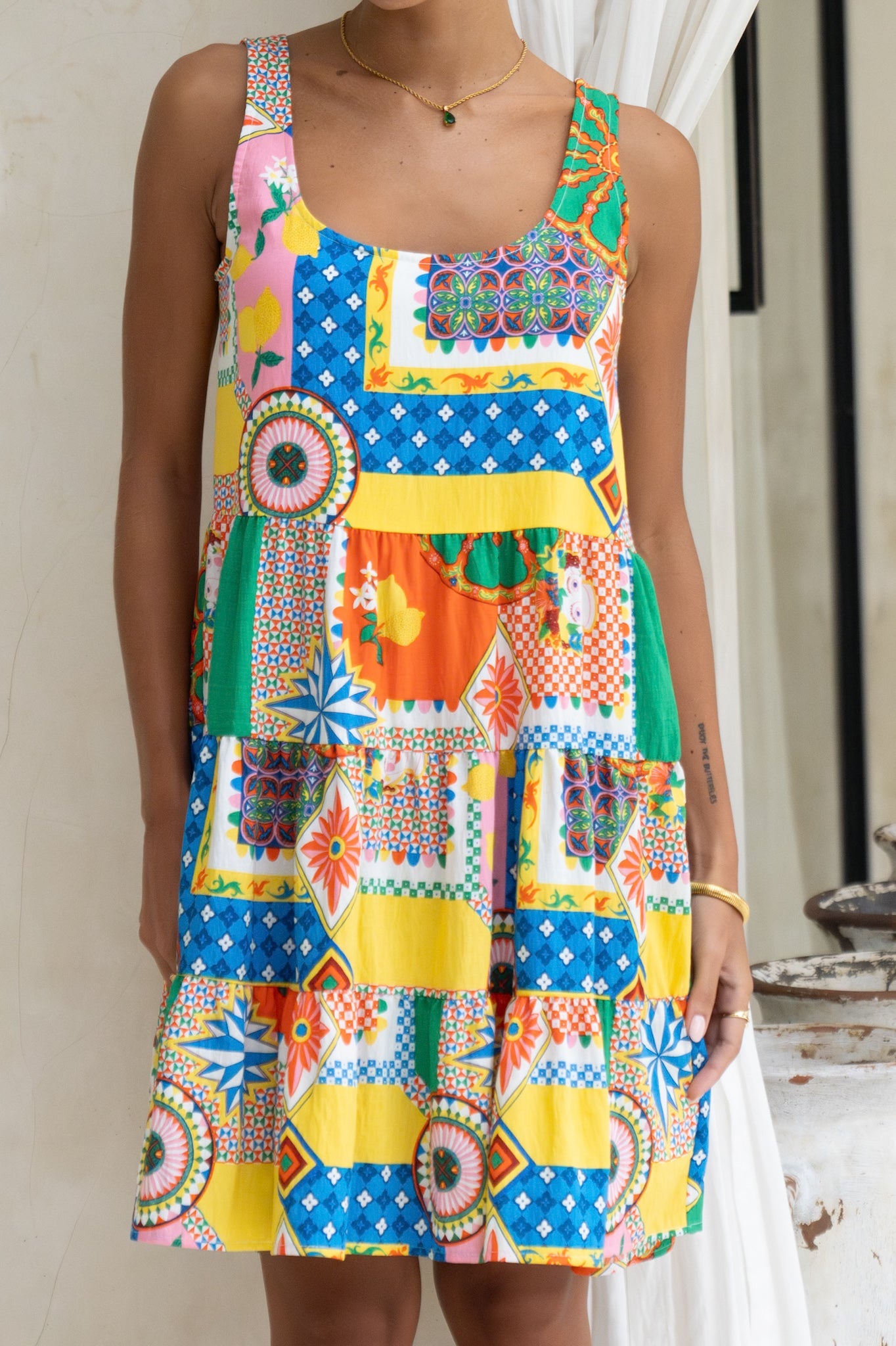 Allegra Multicolour Patchwork Scoop Neck Mini Dress