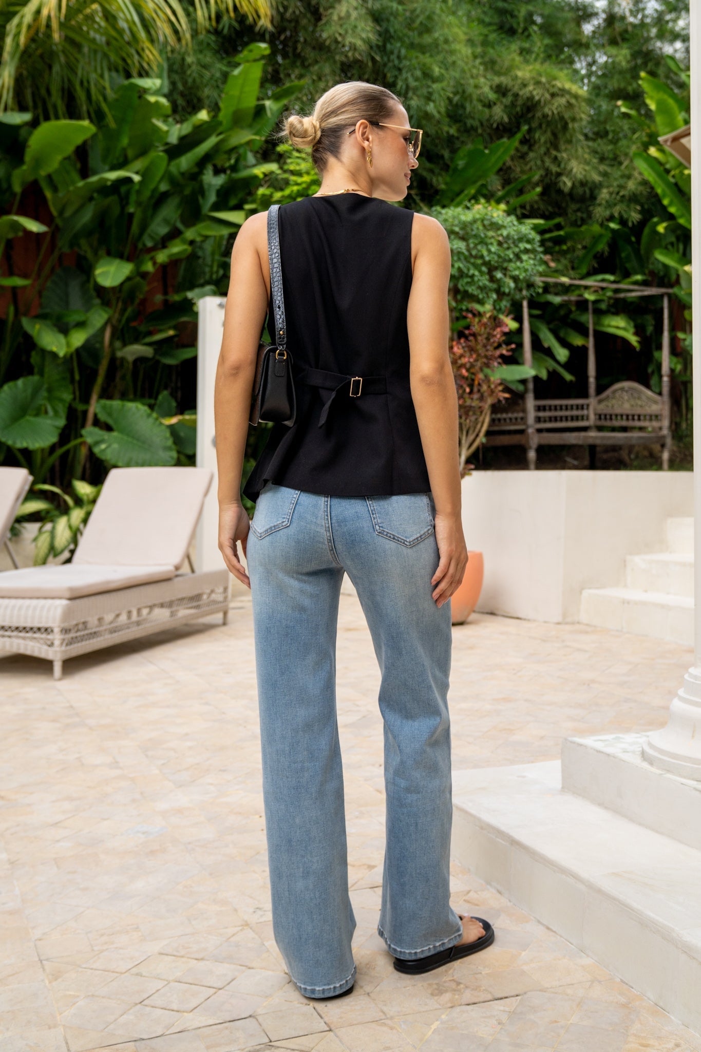 The Avril Black Tailored Vest is sleek in the way that makes people stare just a second longer. Maybe it's the cinched-in waist with that back belt detail (so good). Maybe it's the V neckline that makes layering feel luxe, not stuffy. Or maybe it’s those standout gold buttons doing all the talking. (They catch light like they were made for golden hour.)