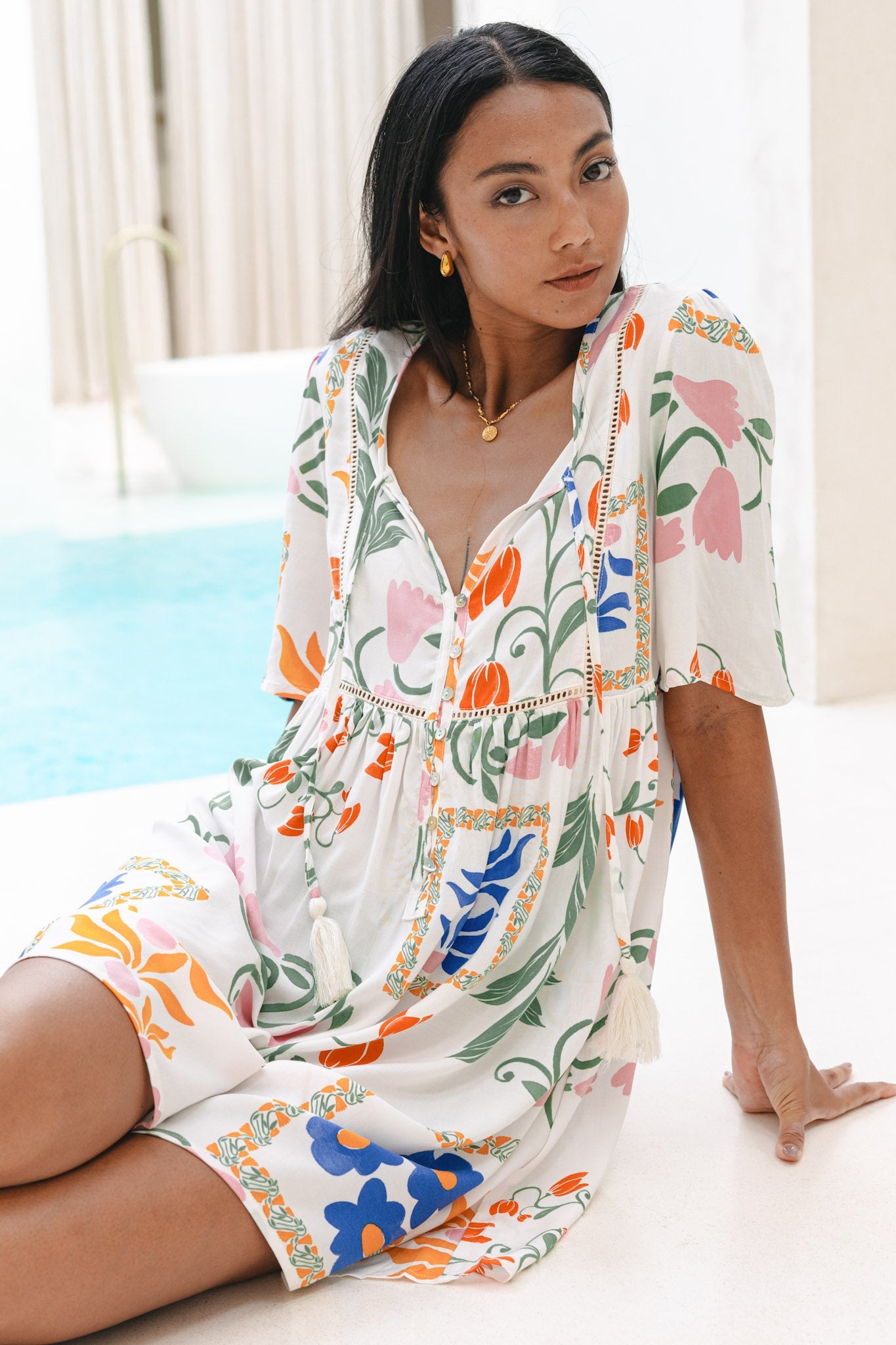 The Calantha dress is the perfect way to capture a feminine mood! This pretty mini dress is made from rayon fabric and features a V-neckline, button-down front bodice, short sleeves, mini length and a multicoloured floral print throughout. It's a stunning dress that's perfect for a day date, long lunch and more.