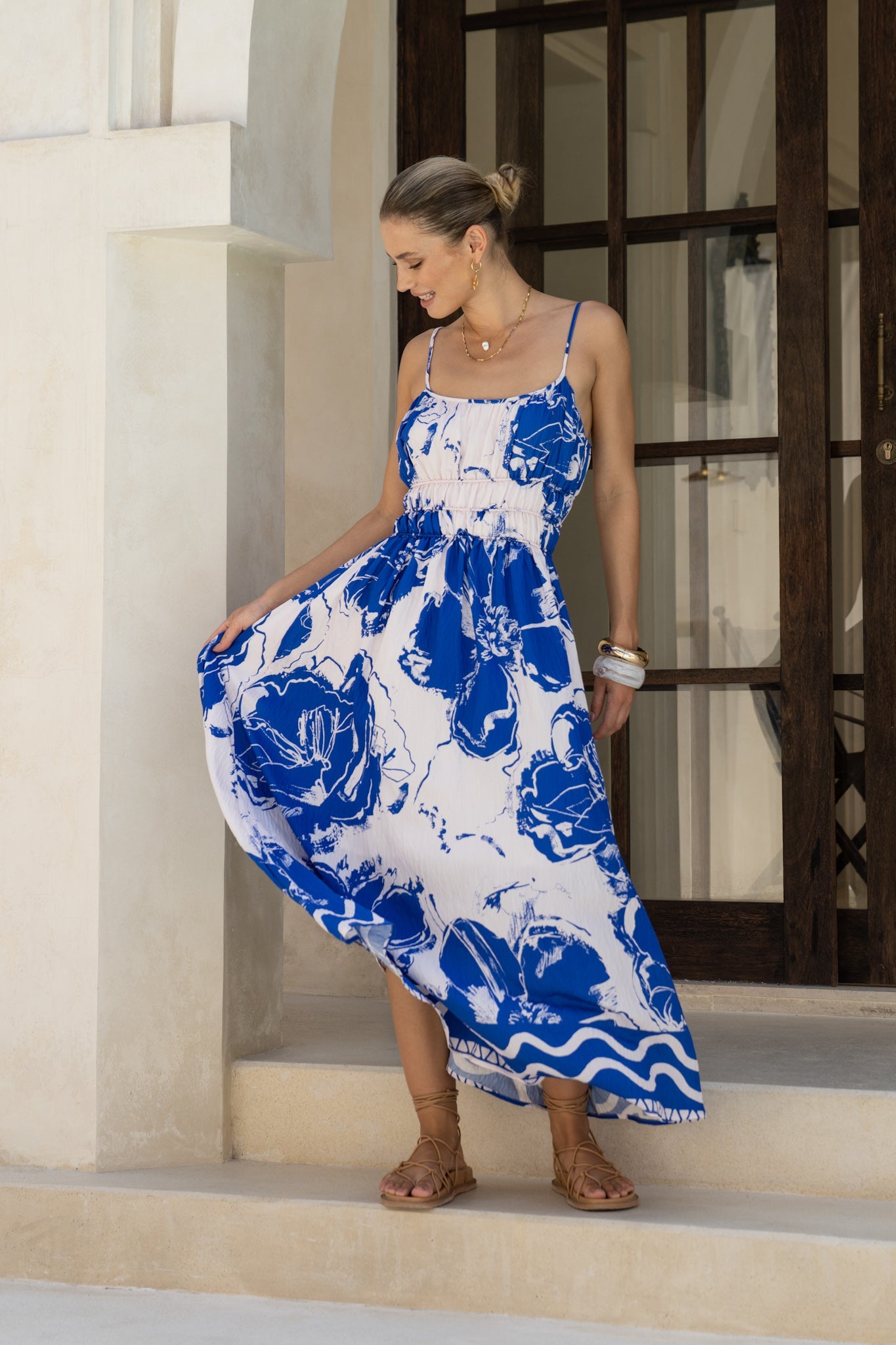 The cobalt blue floral print? Electric. A little bit retro, a little bit Riviera, like something you'd wear while strolling through a Santorini laneway or picking out sea glass from the sand. The ruched waist creates that just-right cinch (snatched, but not squeezed), while the flared hem floats with every step like you're starring in your own soft-focus film montage.