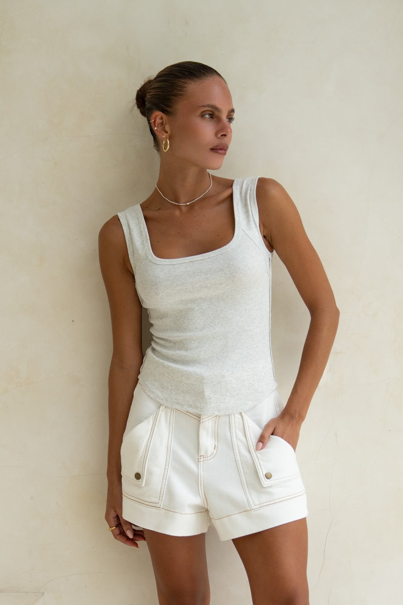 Our Denia White Denim Cargo Shorts is the epitome of comfort and style for summer. Crafted from denim, these high-waisted shorts offer a flattering fit that moves with you. The two large front pockets with button flaps not only add a touch of utilitarian charm but also provide convenient storage space. The button and zipper closure at the front ensure a secure fit, while the two back pockets complete the classic denim look. Embrace the versatility of the white hue that effortlessly pairs with any ensemble. Elevate your summer wardrobe with the perfect blend of fashion and functionality in our Denia White Denim Cargo Shorts.