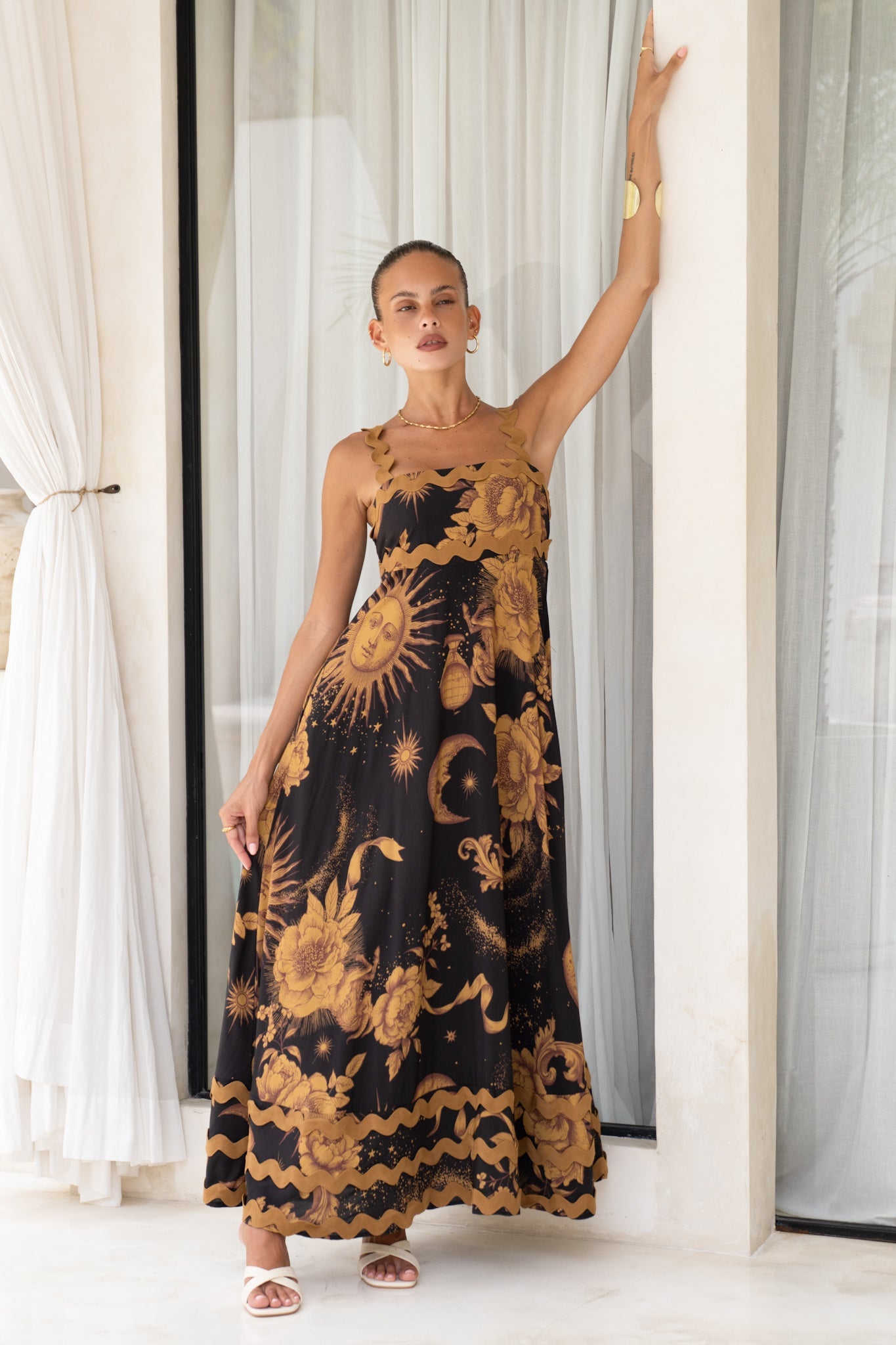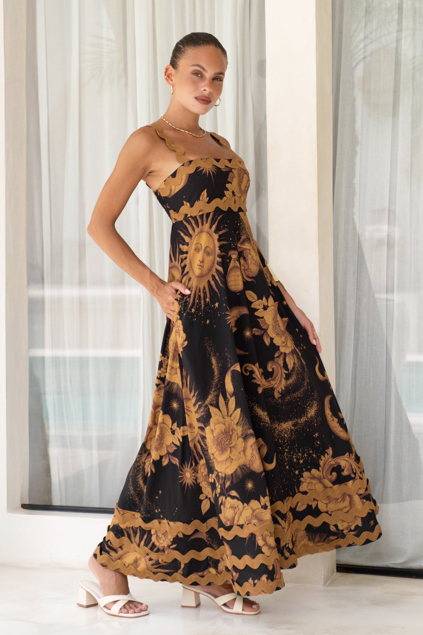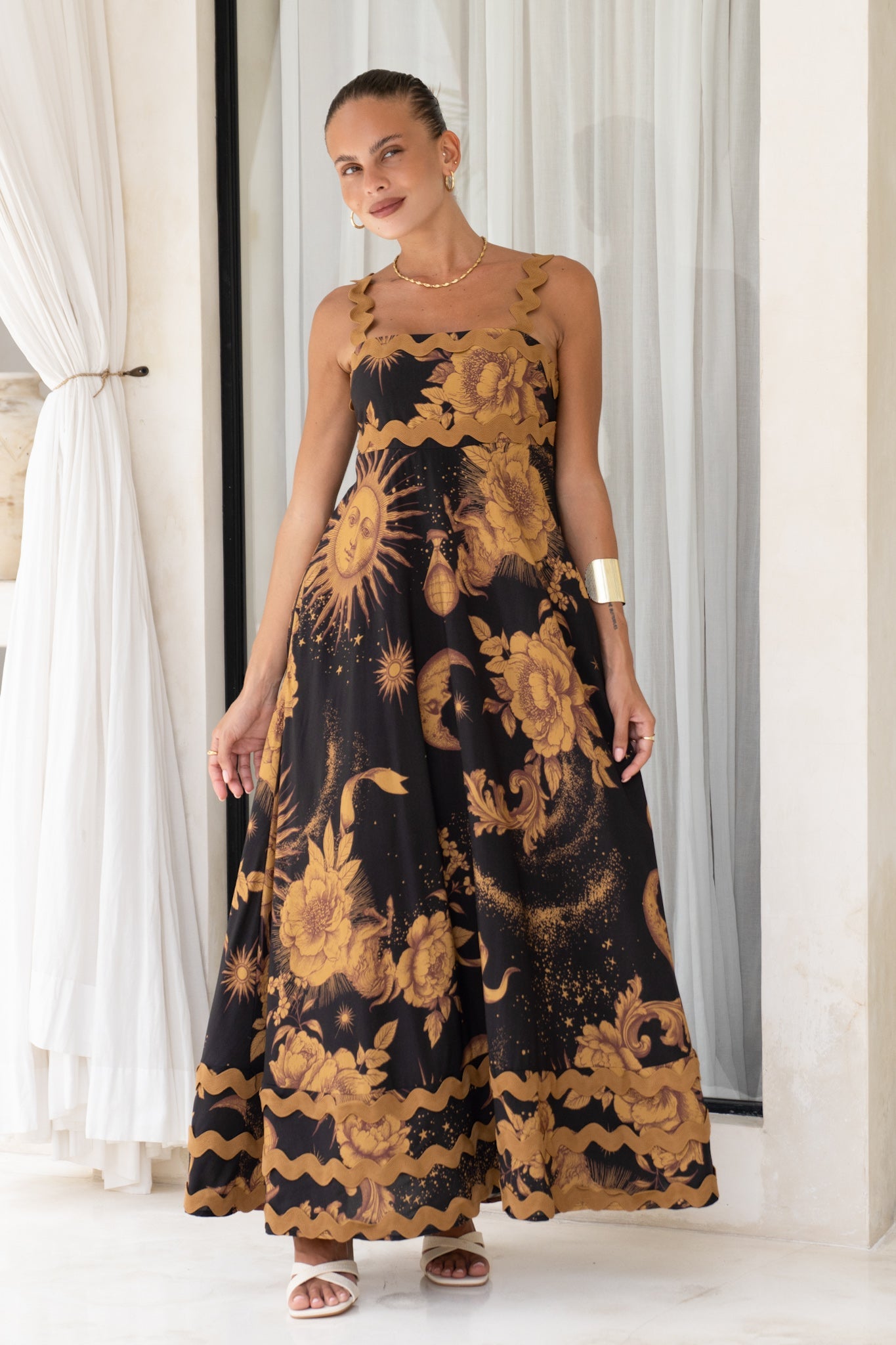 Indulge in the carefree allure of summer with the Estella Black Abstract Floral Ric Rac Maxi Dress. This enchanting maxi dress boasts a distinctive square neckline and whimsical ric rac trim straps that add a touch of playfulness to your ensemble. The shirred stretchy bodice at the back ensures both comfort and a flattering fit, while the two side pockets offer a practical and stylish detail. Immerse yourself in the tranquillity of whimsical vibes with the captivating brown ric rac trim, set against a backdrop of a black and gold abstract floral print. Perfect for sun-soaked days or moonlit evenings, the Estella dress effortlessly combines comfort, style, and the laid-back elegance of summer.
