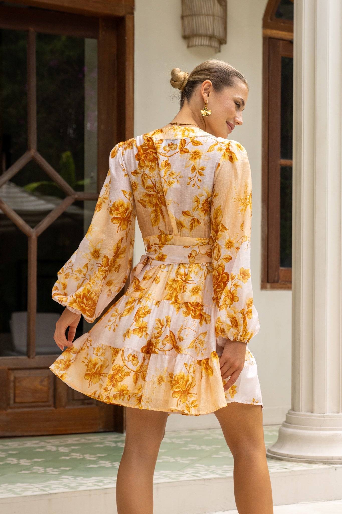 If sunshine were a dress... Fiorella would be it. She's flirty, floaty, and totally feeling herself. Wrapped in a painterly yellow floral print (think dreamy watercolours at golden hour), this mini is what you wear when you want to be noticed without shouting.