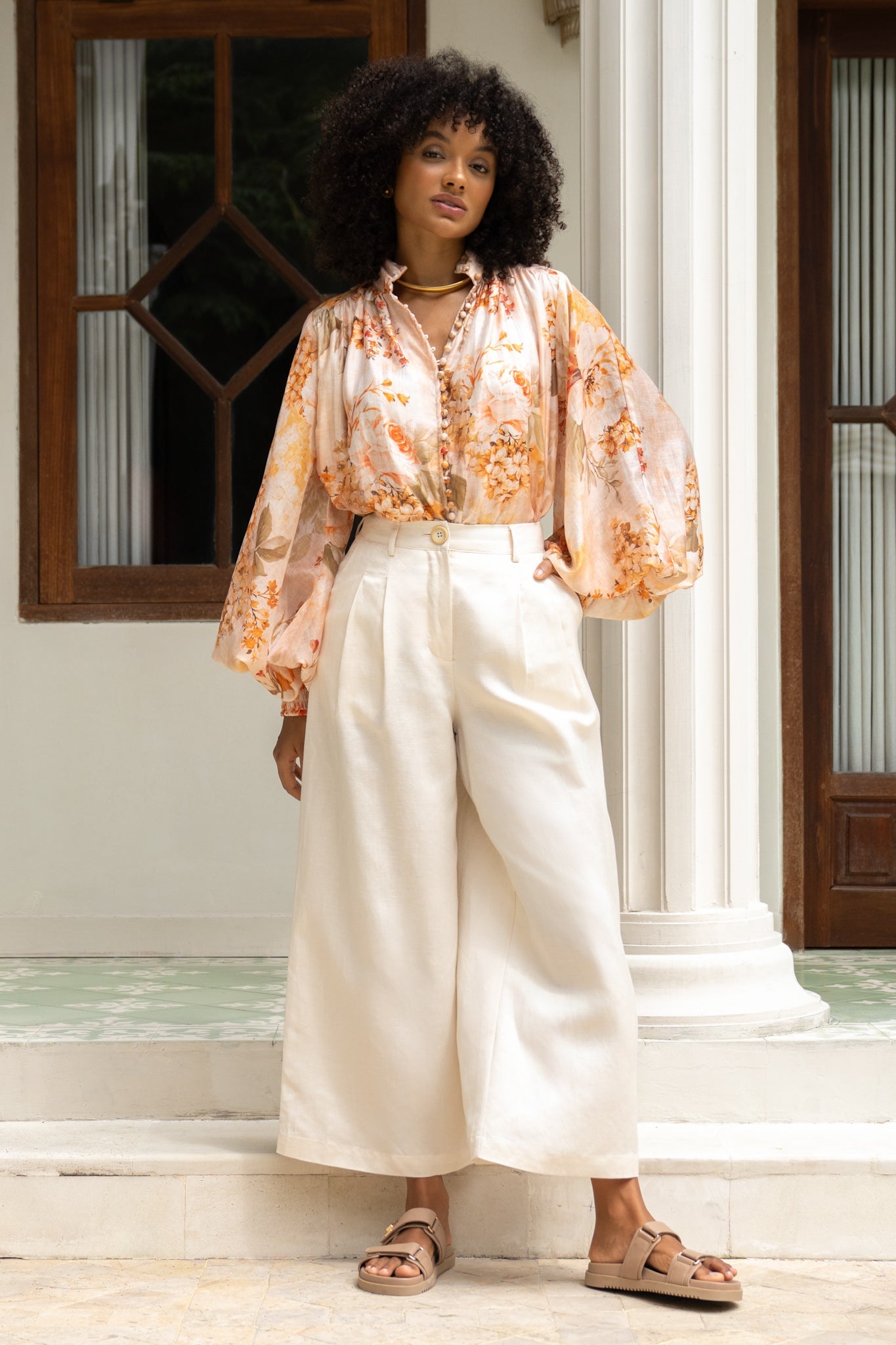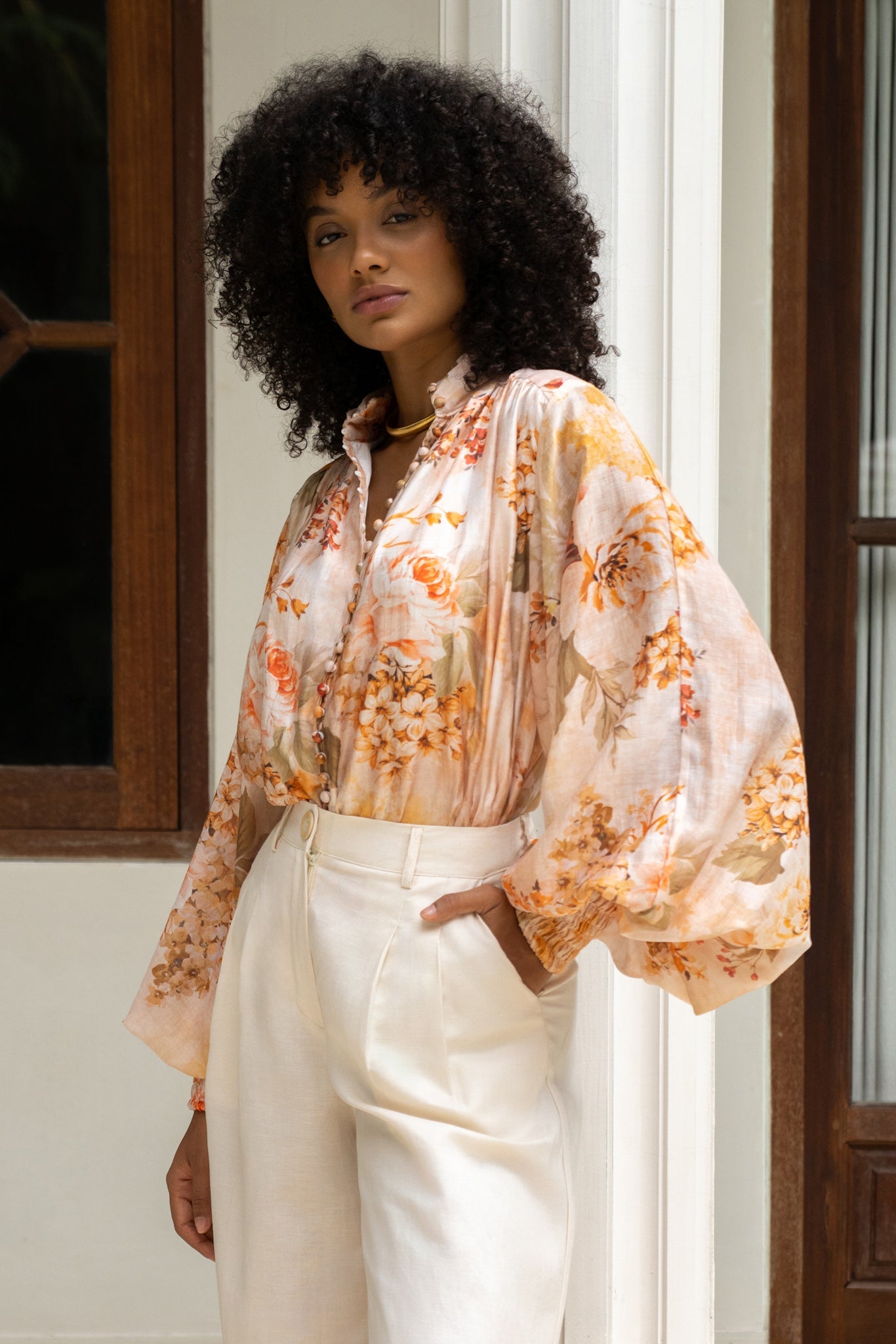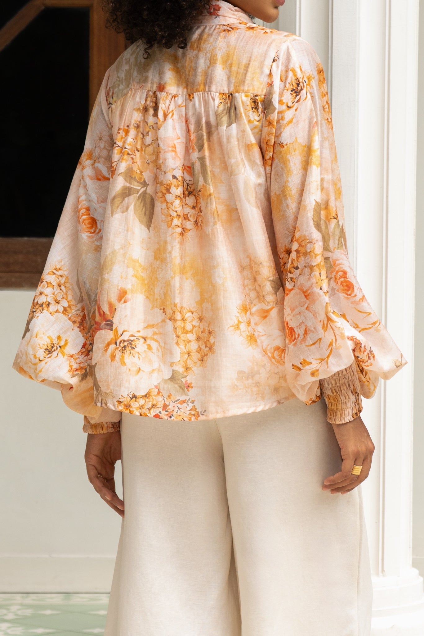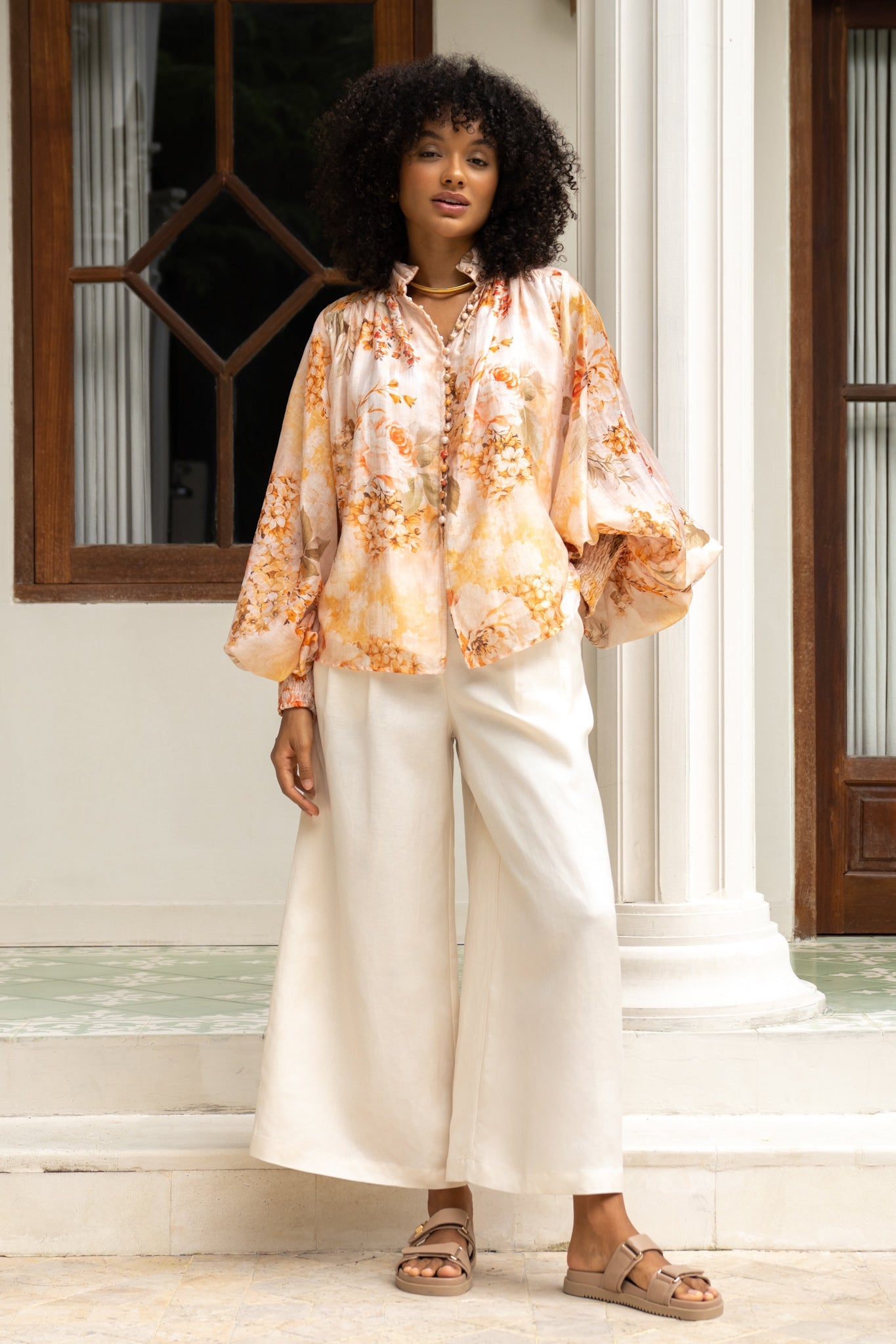 Whisper-light and wildly romantic, this blouse doesn’t just drape, it dances. The pleated mandarin collar adds a hint of vintage hauteur, while those covered buttons? A dream. Not fussy, just thoughtful. Sleeves billow just enough to feel like you’ve wandered out of an old Italian painting, cinched at the wrist with soft shirring that lends a delicate finish. And the fabric? Breezy, feather-soft, and made to move (preferably through a sun-drenched piazza or your local café. We don’t judge). It’s the kind of piece that makes an entrance without ever trying to. Pair it with wide-leg trousers, floaty skirts, or even denim. It’s fluid, it’s feminine, and honestly, a little magic.