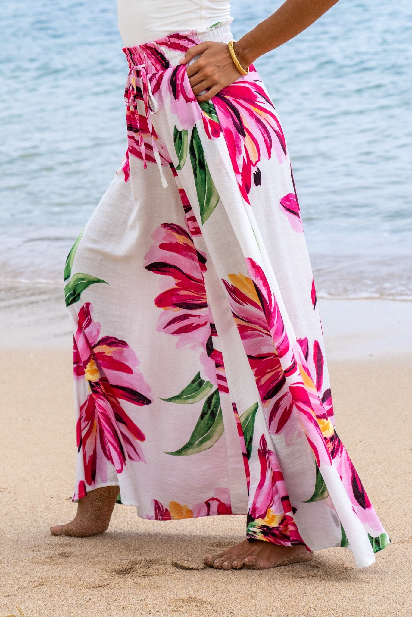 Elevate your wardrobe with the Gracie Pink Floral Wide Leg Pants. These gorgeous pants feature a bold and beautiful print in an elegant wide-leg fit. With the elastic self-tie waist, you can customise the fit to your body shape for the ultimate comfort and confidence. These beautiful pants also have side pockets, so you can keep your essentials close without compromising style. Constructed in breathable fabric, these pants ensure you stay cool throughout summer days or nights. Whether you're going for a relaxed weekend look or something more casual-chic, these nature-inspired pants are perfect for any occasion!