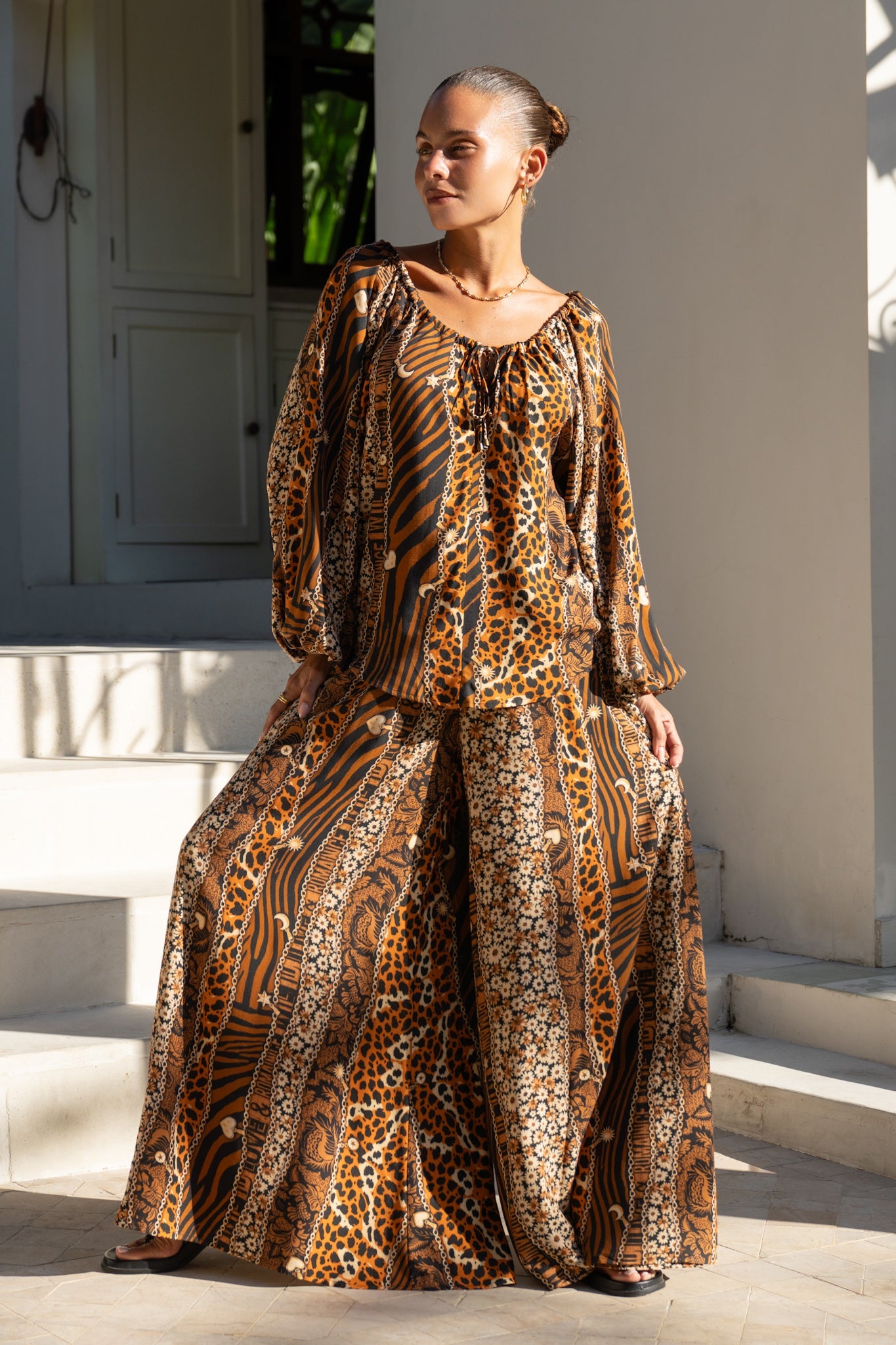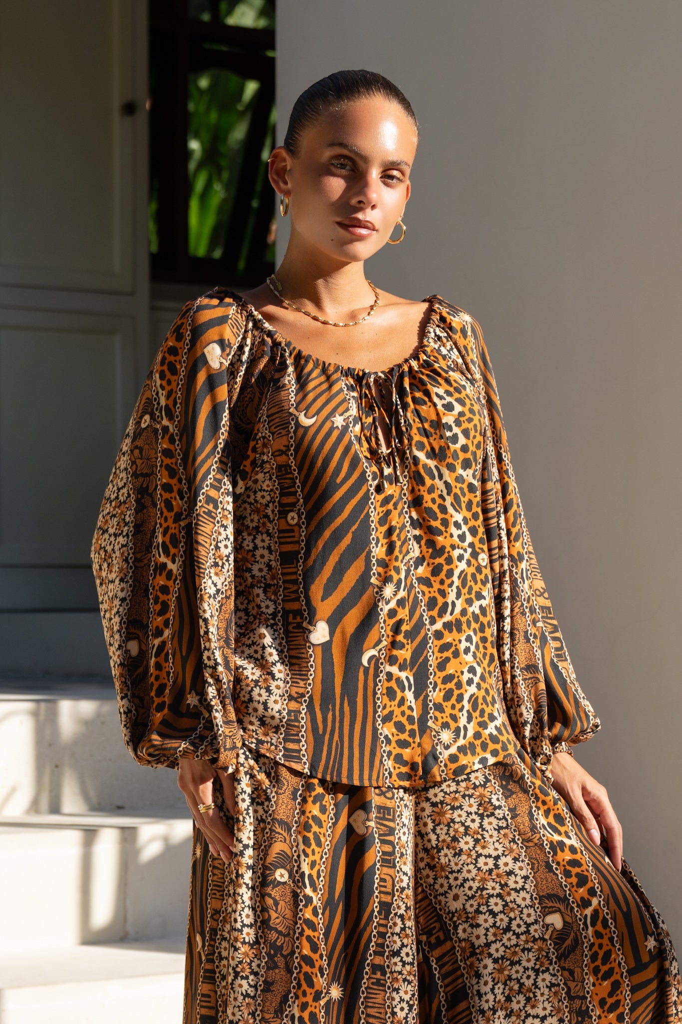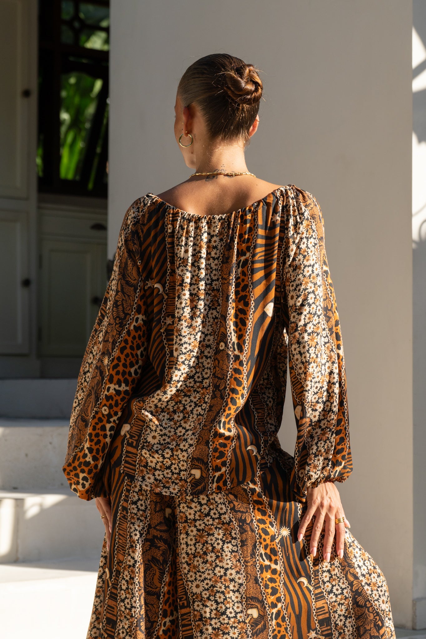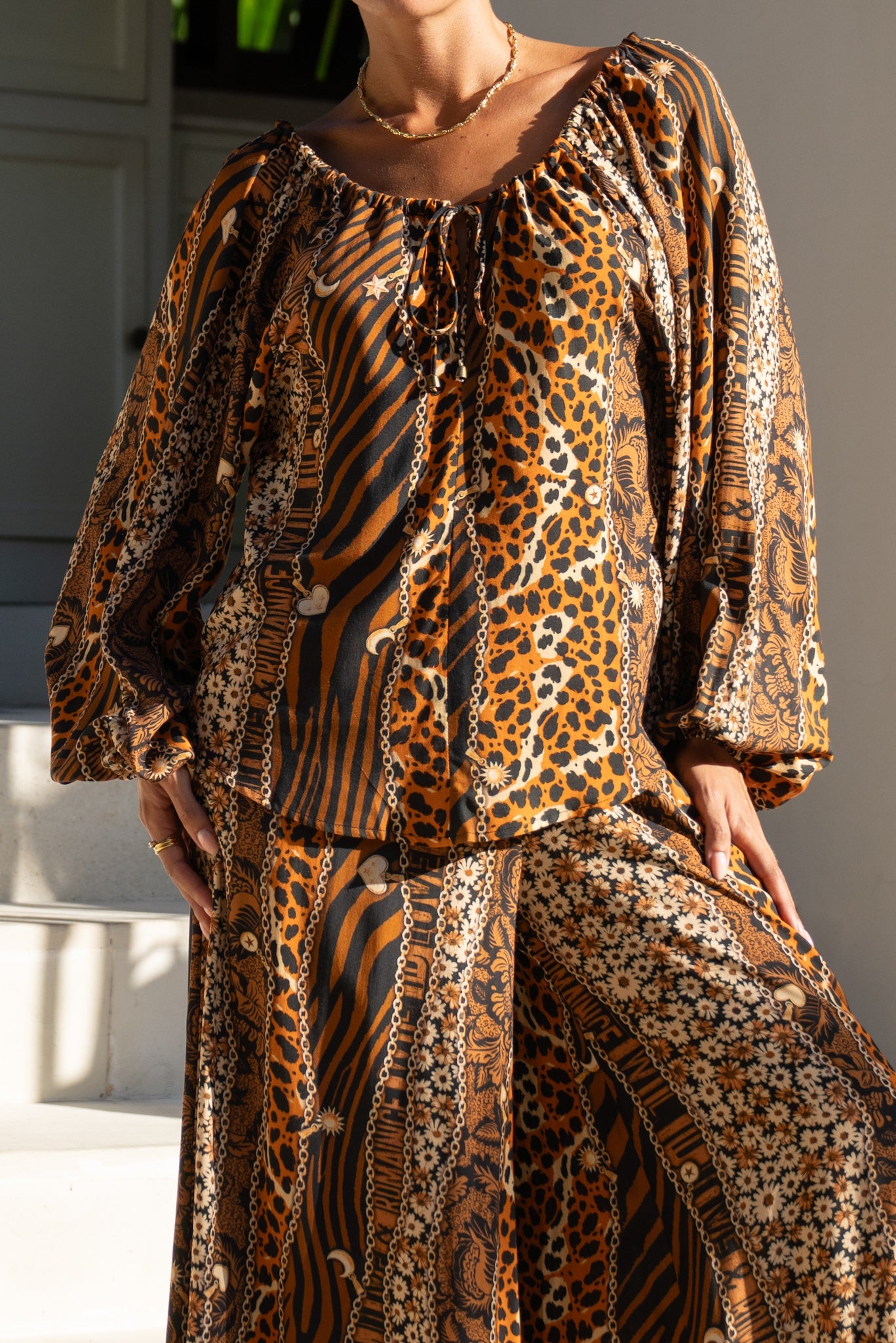 The Malika Blouse captures that slow, sun-drenched energy. All lightness, softness, and a hint of wanderlust. Cut in a billowy silhouette that skims the body just right, it features a gentle scoop neckline with a drawstring tie you can adjust to suit your mood. Wear it slightly open or pulled close, slipped off the shoulder or styled just so. The voluminous sleeves float with you, tapering at the cuffs to create a soft, gathered shape. Its brown leopard print keeps things grounded, while the relaxed fit makes it easy to tuck, drape, or wear loose. Effortless and versatile, it’s the kind of piece that feels as good as it looks, whether you're barefoot on the coast or layered up for the city.