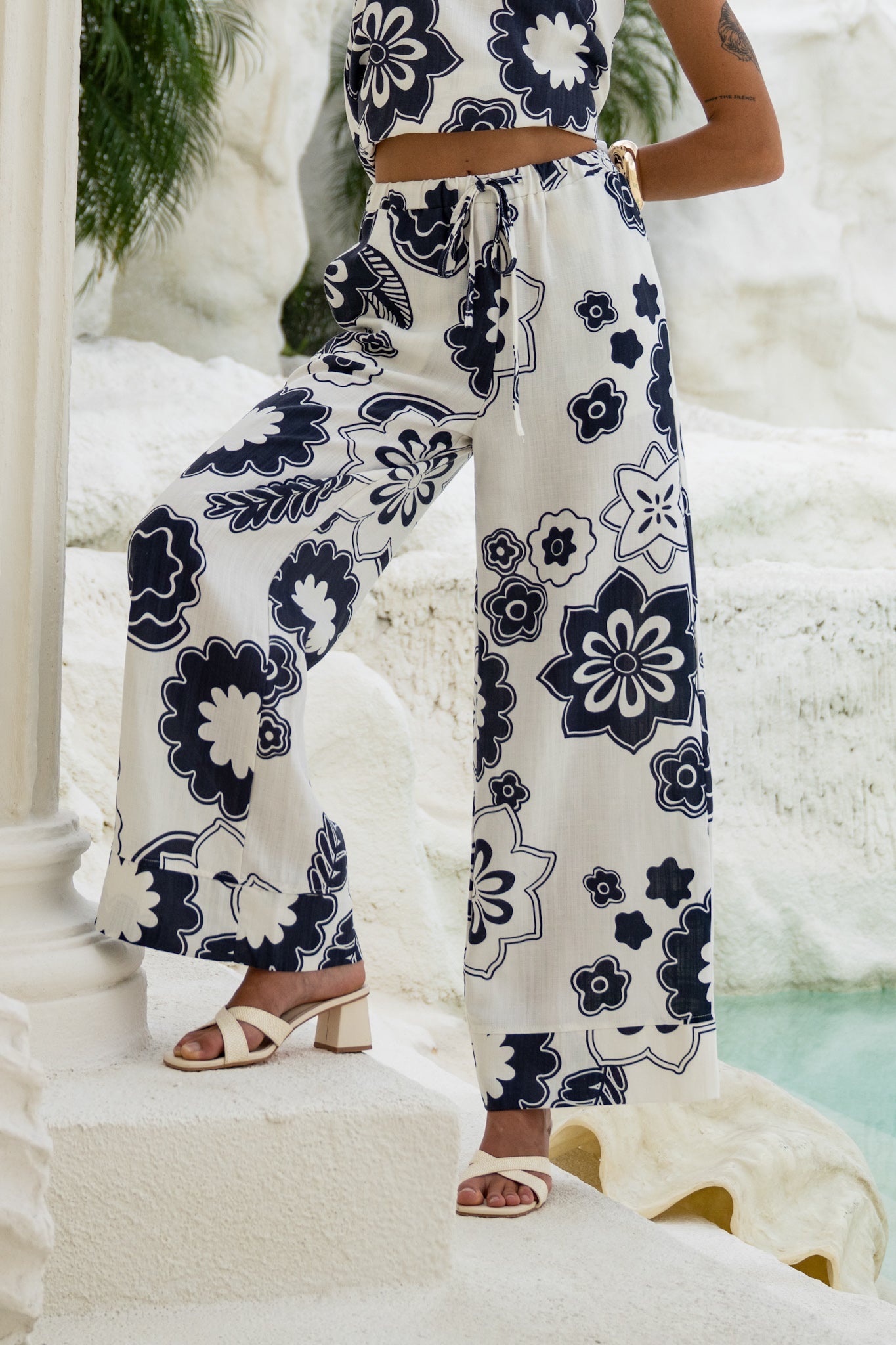 The navy floral print is unapologetically bold but softened by a gentle beige background that keeps things grounded. Think retro wallpaper meets runway vibes with a side of holiday ease. Whether you’re brunching, gallery-hopping, or just living your best loungy life, these pants will be the comfiest flex in your closet.