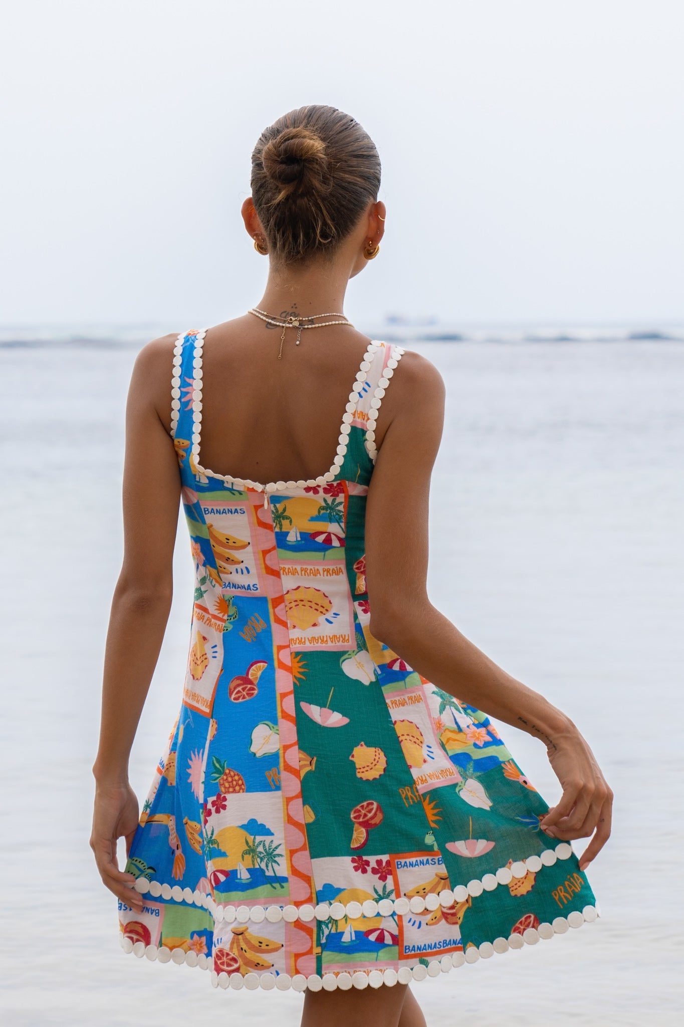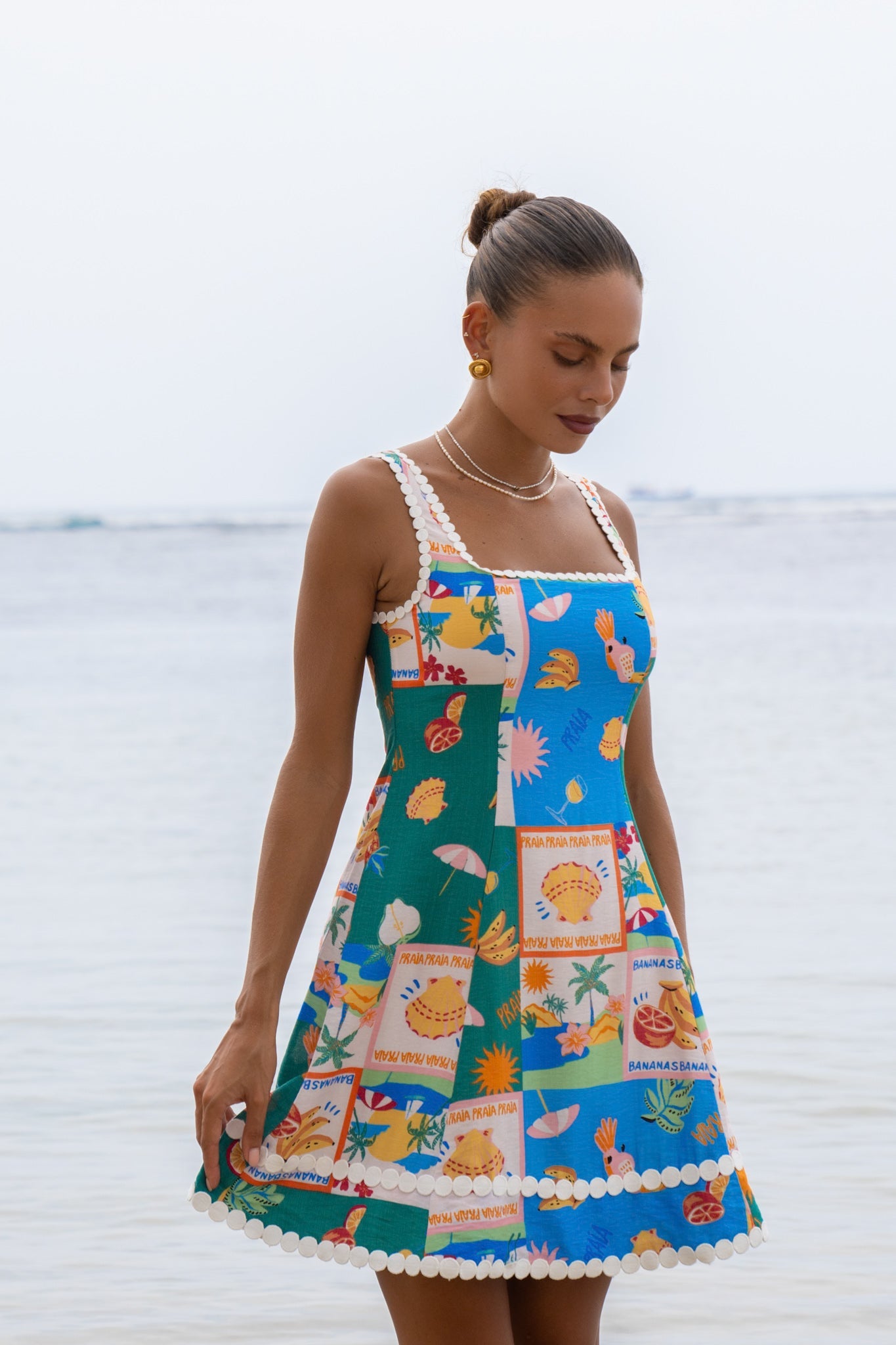 Step into tropical elegance with the Praia Multicolour Tropical Lace Detail Mini Dress, a vibrant and playful addition to your wardrobe. This sleeveless dress features a square neckline adorned with a delicate white circular lace trim, adding a touch of femininity to its bold design. The fit and flare silhouette enhances your figure, while the mini length creates a youthful and breezy look. Complete with a hidden back zipper for easy wear, this dress is perfect for summer outings, beachside parties, or casual gatherings. The eye-catching Praia multicolour tropical abstract fruity print ensures you’ll stand out wherever you go.