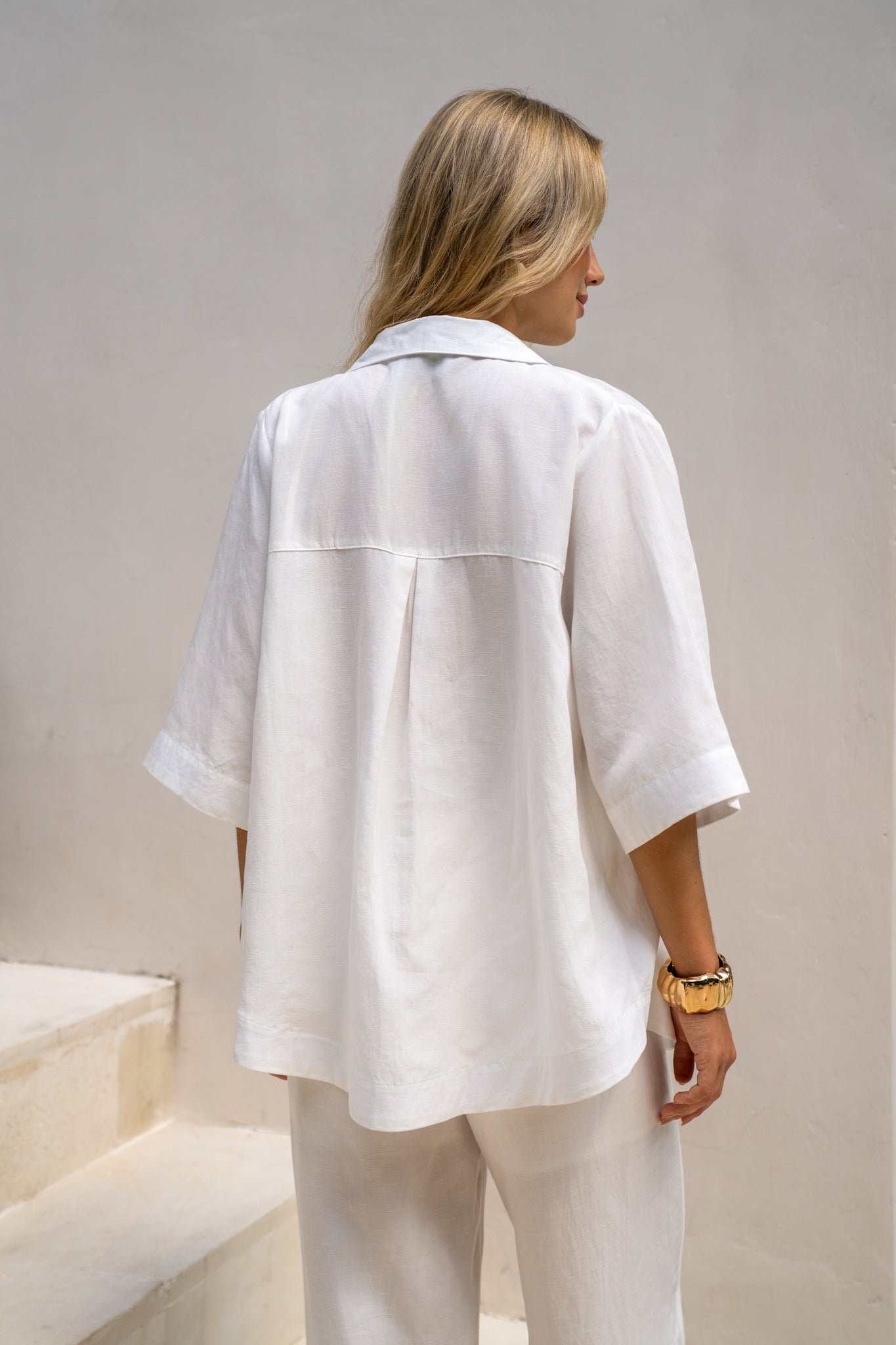 Crafted from a dreamy blend of linen and tencel (yes, it breathes and drapes), it’s the kind of piece that looks chic whether you’ve buttoned it all the way to the collar or flung it over a bikini at golden hour. The oversized silhouette feels nonchalant on purpose. Roomy sleeves (a little drop-shouldered, a little vintage) invite the breeze. The back pleat? A subtle nod to tailoring, but make it artsy.