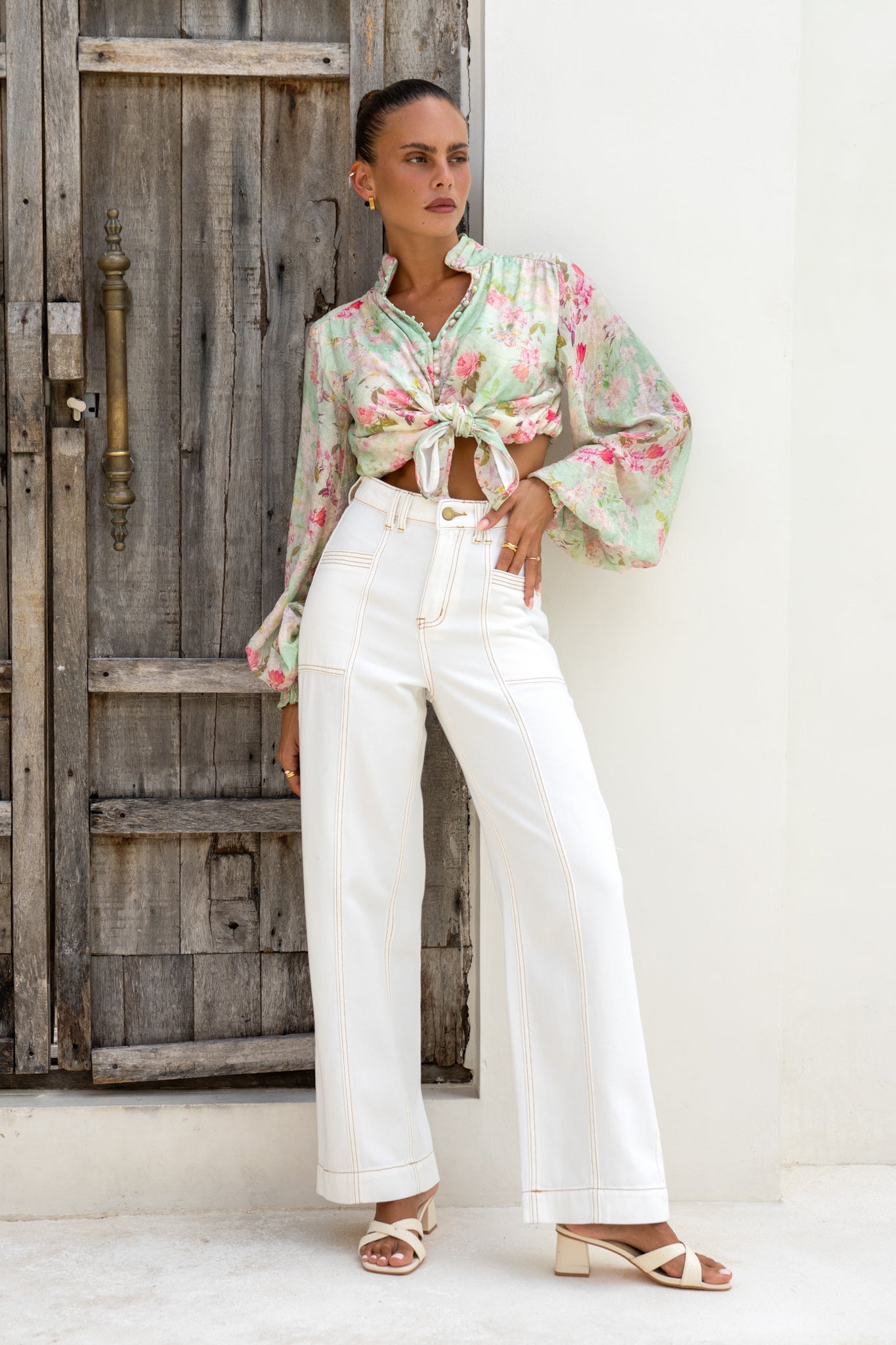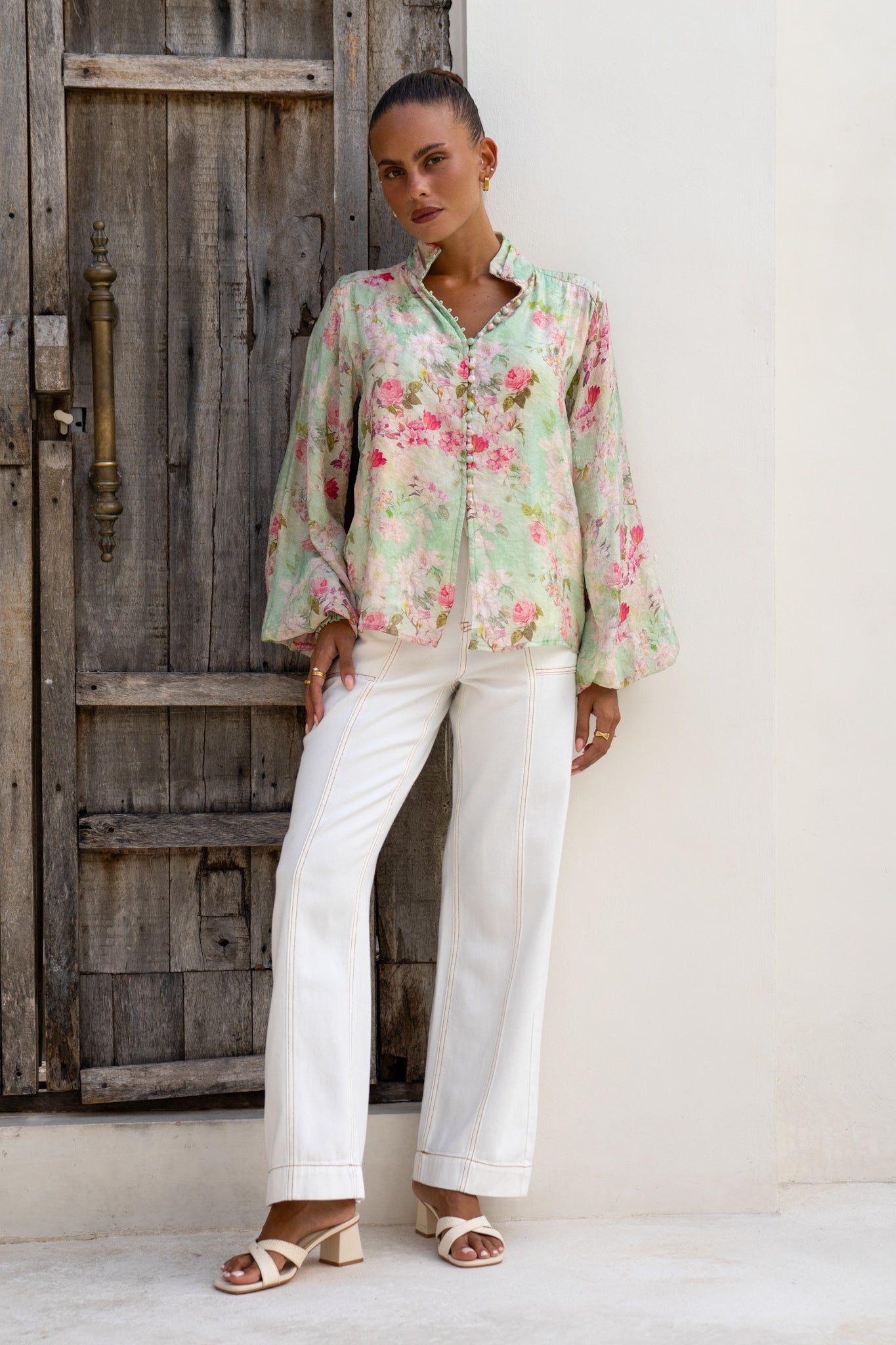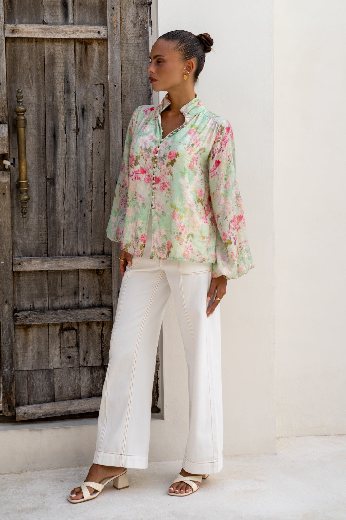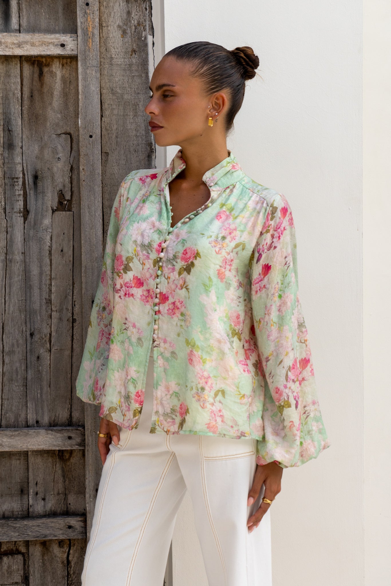 Meet the blouse that’s giving main-character energy without shouting about it. Sheila is floaty, flirty, and just the right amount of dramatic (we're talking puffed balloon sleeves that practically beg to be photographed mid-stride). There’s a row of delicate fabric-covered buttons marching down the front—like tiny couture soldiers. And that smocked cuff? A low-key masterpiece that keeps everything in place while you wave, reach, or pose casually at brunch.