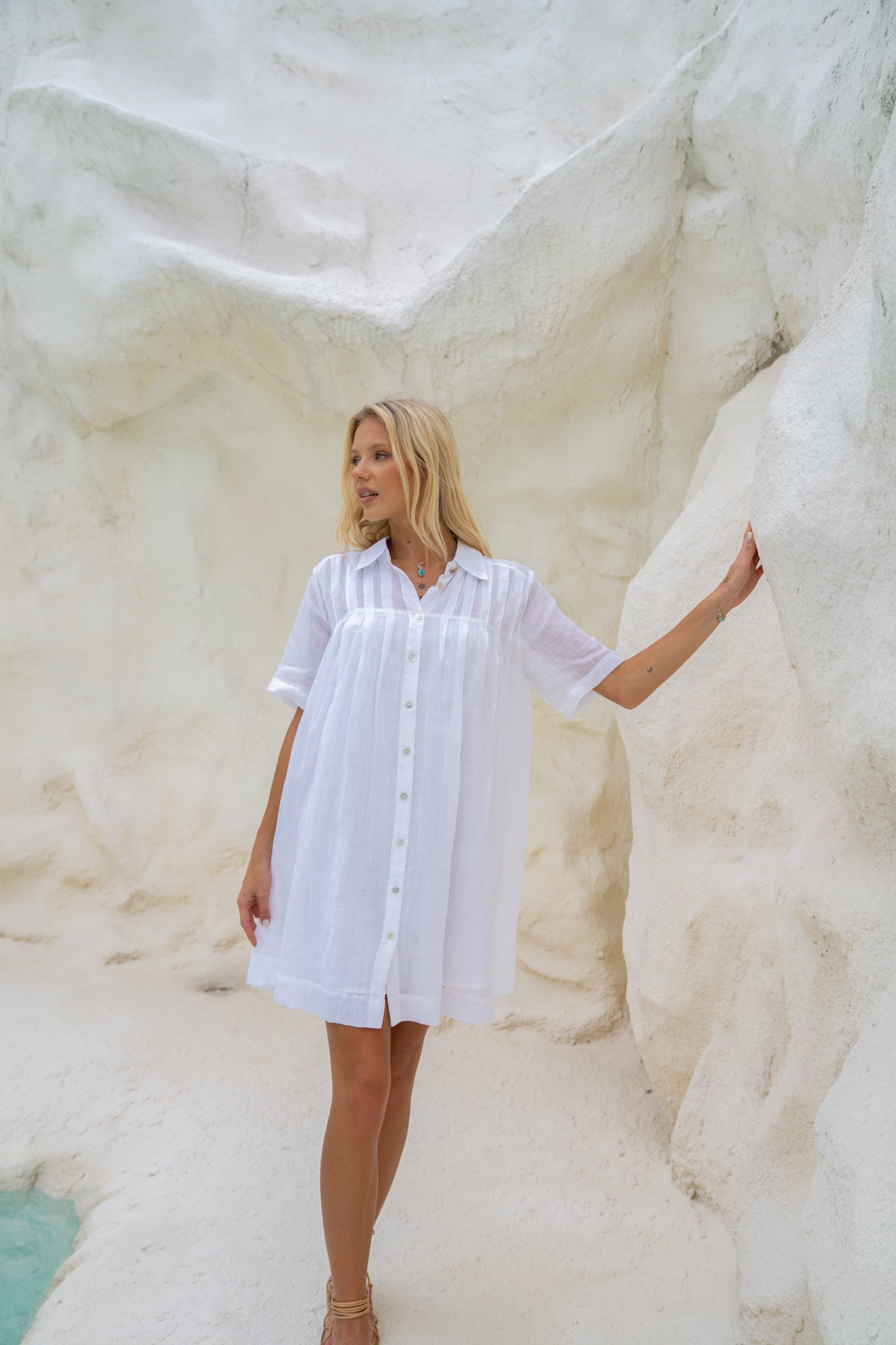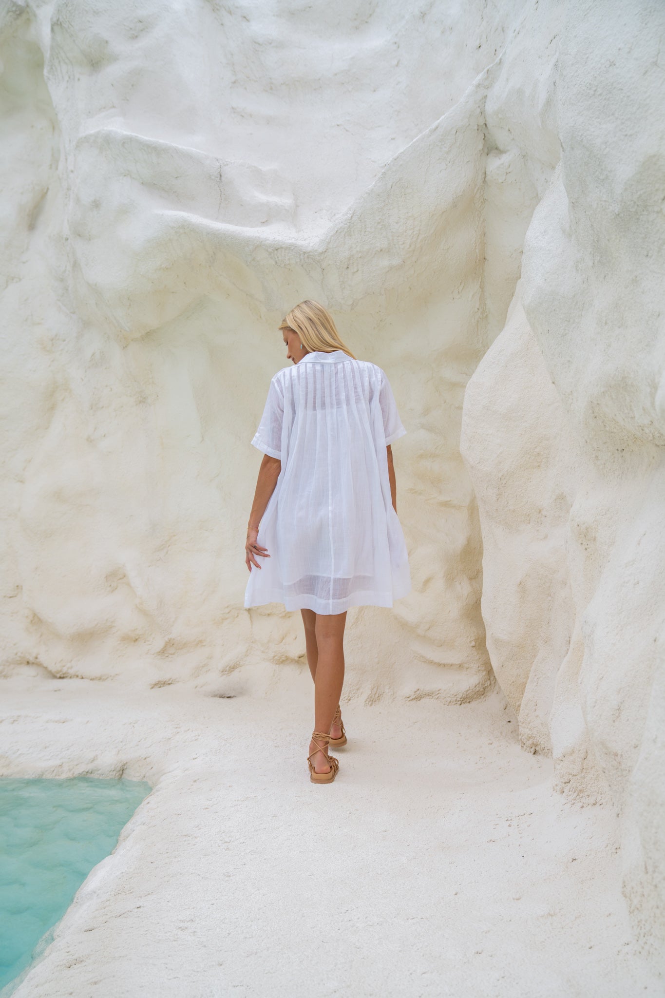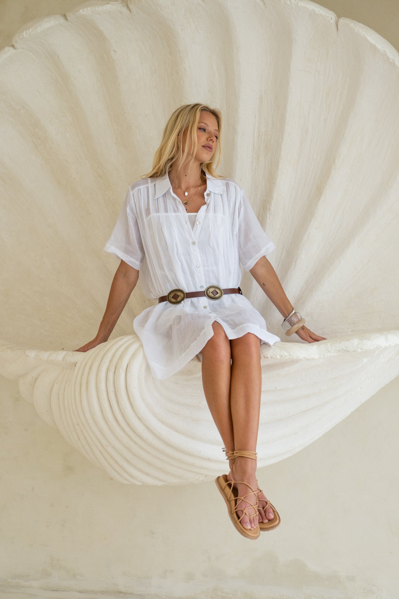 Teya is the kind of dress that makes you feel put-together, even when you rolled out of bed 20 minutes ago. She’s crisp. She’s clean. And she leans into that effortless shirt-dress energy with a little extra refinement.