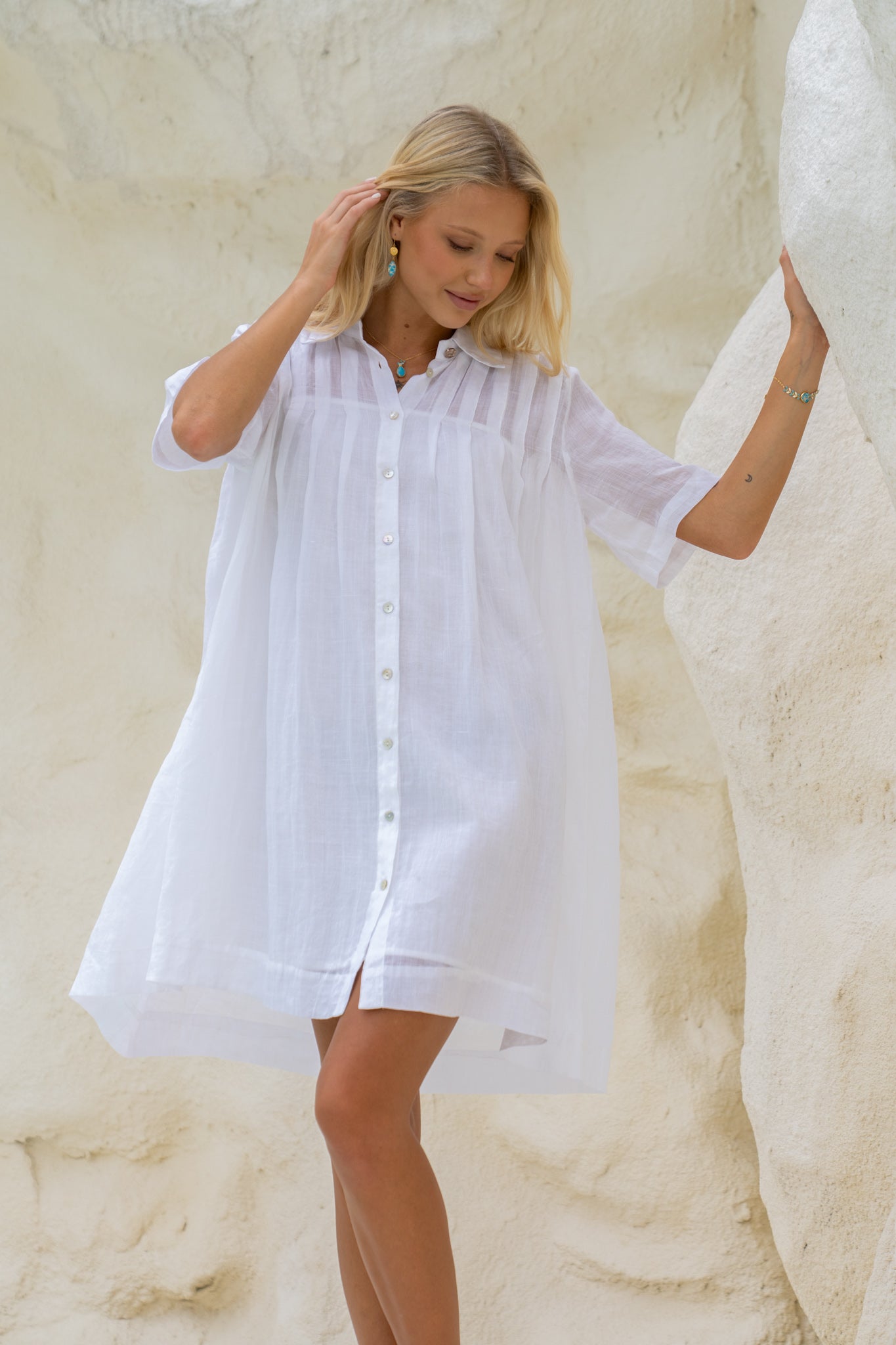 Crafted from airy, 100% ramie, this piece features softly stitched vertical pleats that elongate and flatter without being flashy. The short sleeves are cuffed for a touch of tailoring, while the pointed collar and shell-style buttons add a classic, almost borrowed-from-him vibe but make it chic.