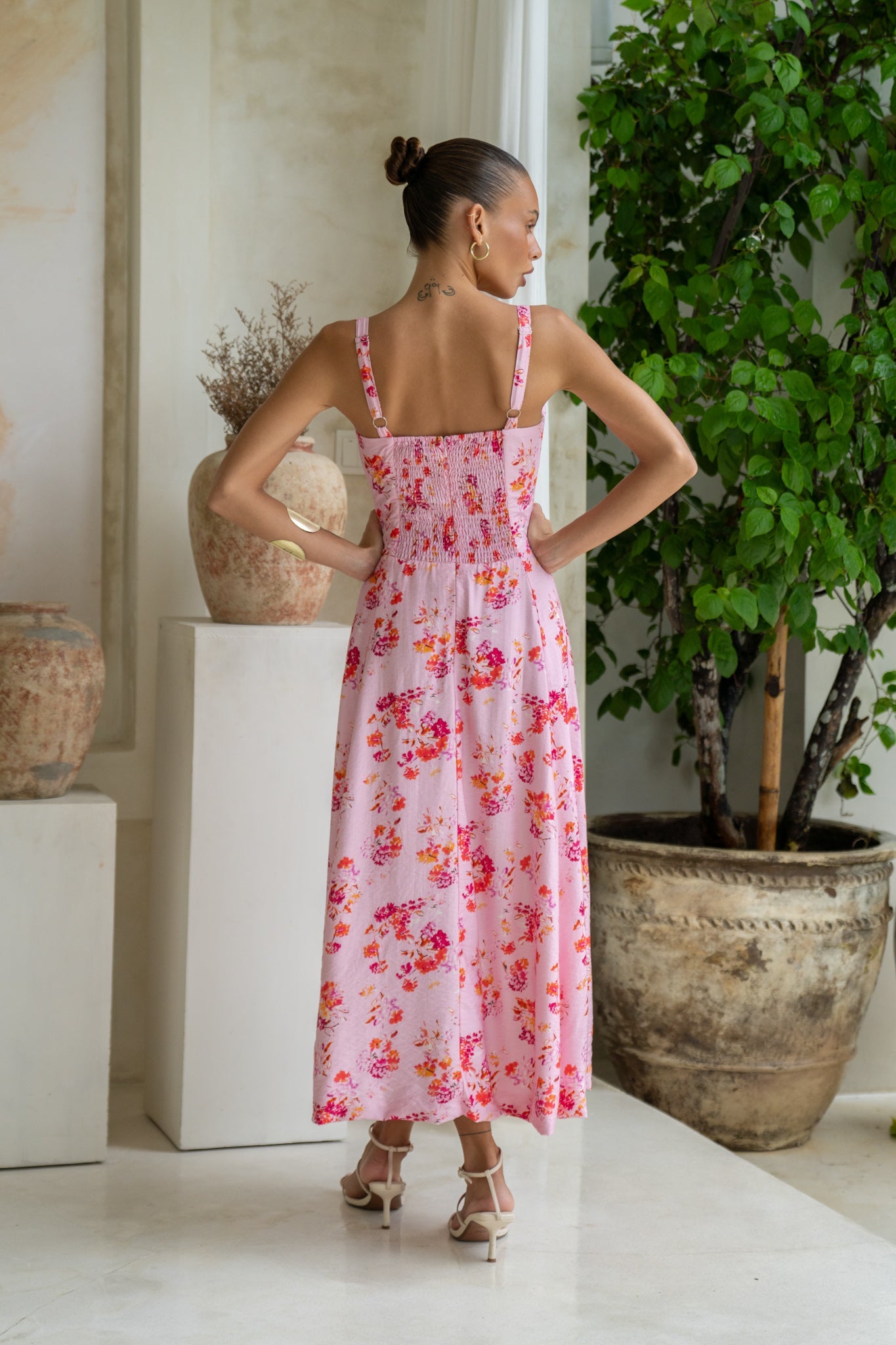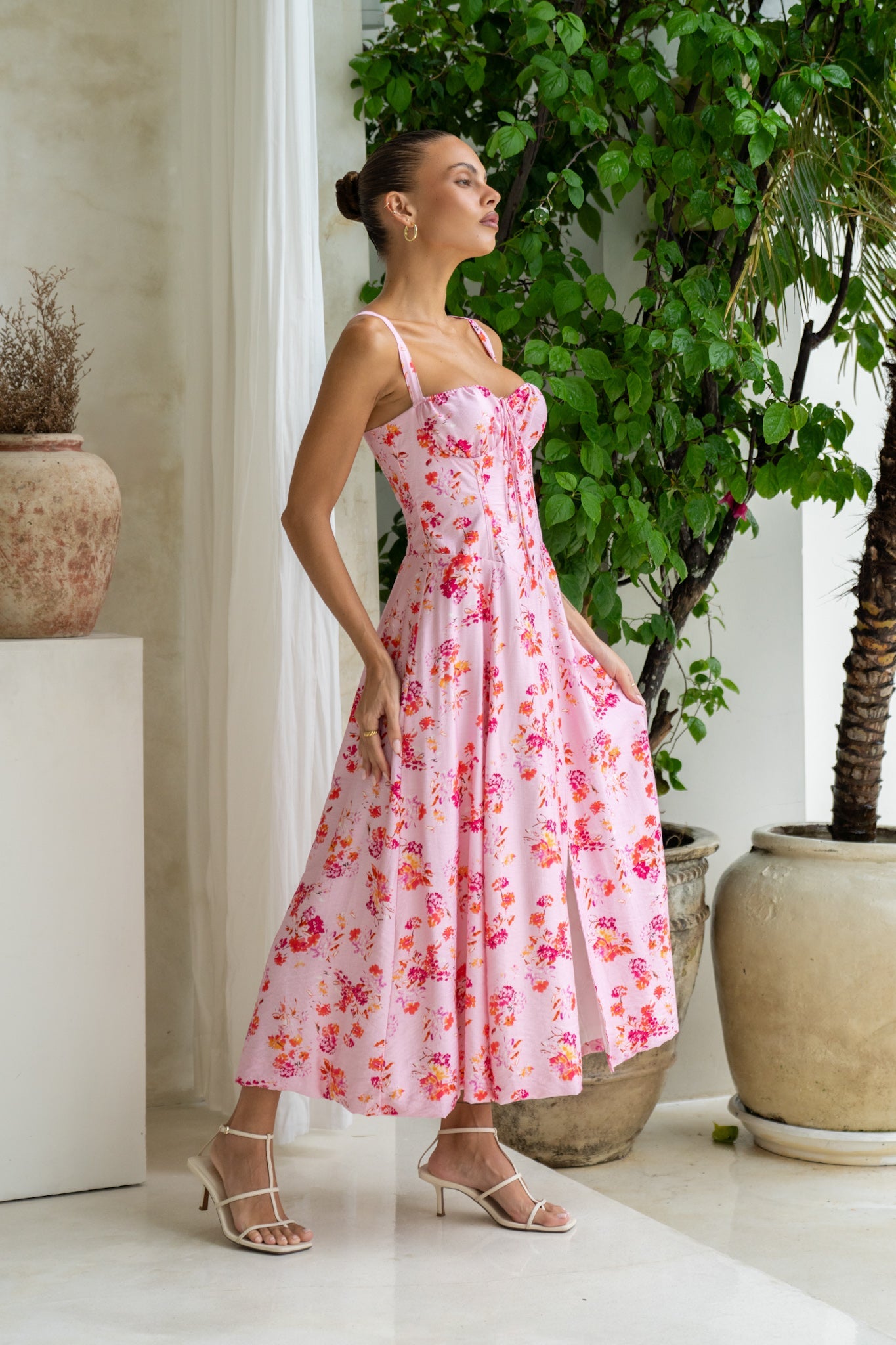 Introducing the Emery Pink Floral Midi Dress – a romantic and feminine dress perfect for special occasions or summer outings. Featuring a sweetheart ruched neckline with an adjustable tie, this dress allows for a customised and flattering fit. The adjustable shoulder straps provide further versatility, while the corset waist detail adds structure and accentuates your figure. The stretchy shirred back bodice ensures comfort, and the invisible zipper at the back allows for easy wear. A stylish leg split adds a hint of allure, while the midi length offers a chic, elegant look. Adorned with a delicate pink floral print, this dress is a timeless addition to your wardrobe.